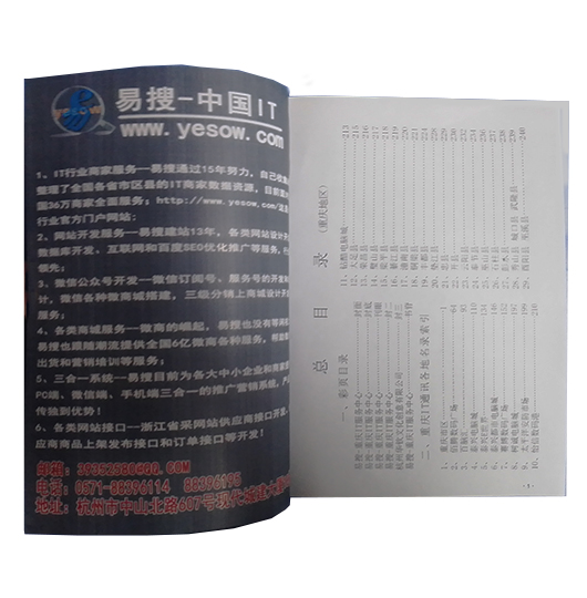 此次的重庆通讯录采用三分栏格式,按照重庆市各个地区编排,其中重庆市区是按电脑城编排的,全书共有240页,商家查找更加方便,更快捷、准确,为您提供更优质的信息与服务,让商家朋友们能够准确快速的找到自己想要的信息,同时本书还收集了重庆市区、大足县、荣昌县、璧山县、梁平县、綦江县、潼南县、铜梁县、丰都县、垫江县、武隆县、忠县、开县、云阳县、奉节县、巫山县、石柱县、彭水县、秀山县、酉阳县、城口县21个区市及周边县市的IT商家信息,我们都对数据进行了收集和整理,确保给你最全面的重庆IT商家信息。我们内容更包括商家电话、手机、联系人、网址等(QQ、邮箱版本可特别订制,订制请上易搜商城)!!