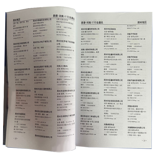 此次的河南通讯录采用三分栏格式,按照河南省各个地区编排,其中郑州地区是按电脑城编排的,全书共有320页,商家查找更加方便,更快捷、准确,为您提供更优质的信息与服务,让商家朋友们能够准确快速的找到自己想要的信息,同时本书还收集了郑州、安阳、新乡、许昌、平顶山、信阳、南阳、开封、洛阳、商丘、焦作、济源、鹤壁、濮阳、周口、漯河、驻马店、三门峡18个区市及周边县市的IT商家信息,我们都对数据进行了收集和整理,确保给你最全面的河南IT商家信息。我们内容更包括商家电话、手机、联系人、网址、QQ、邮箱等!!